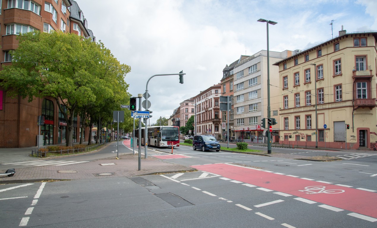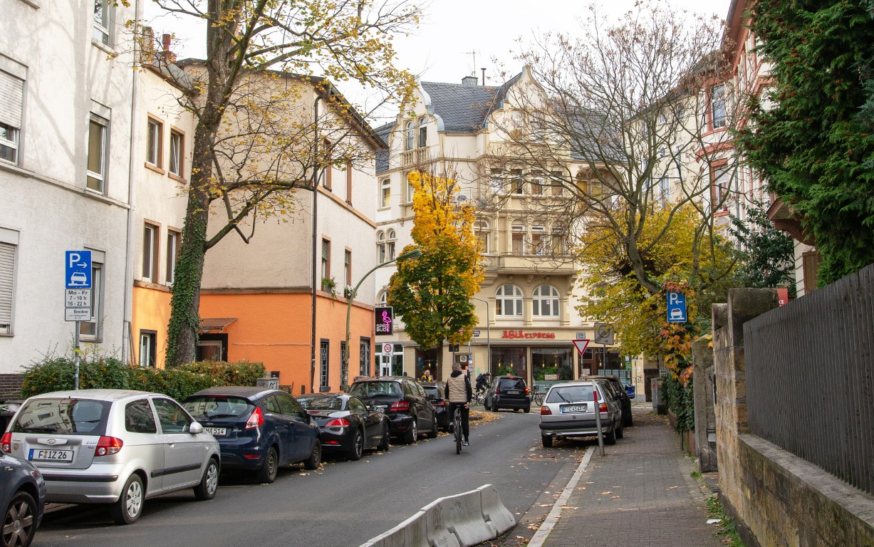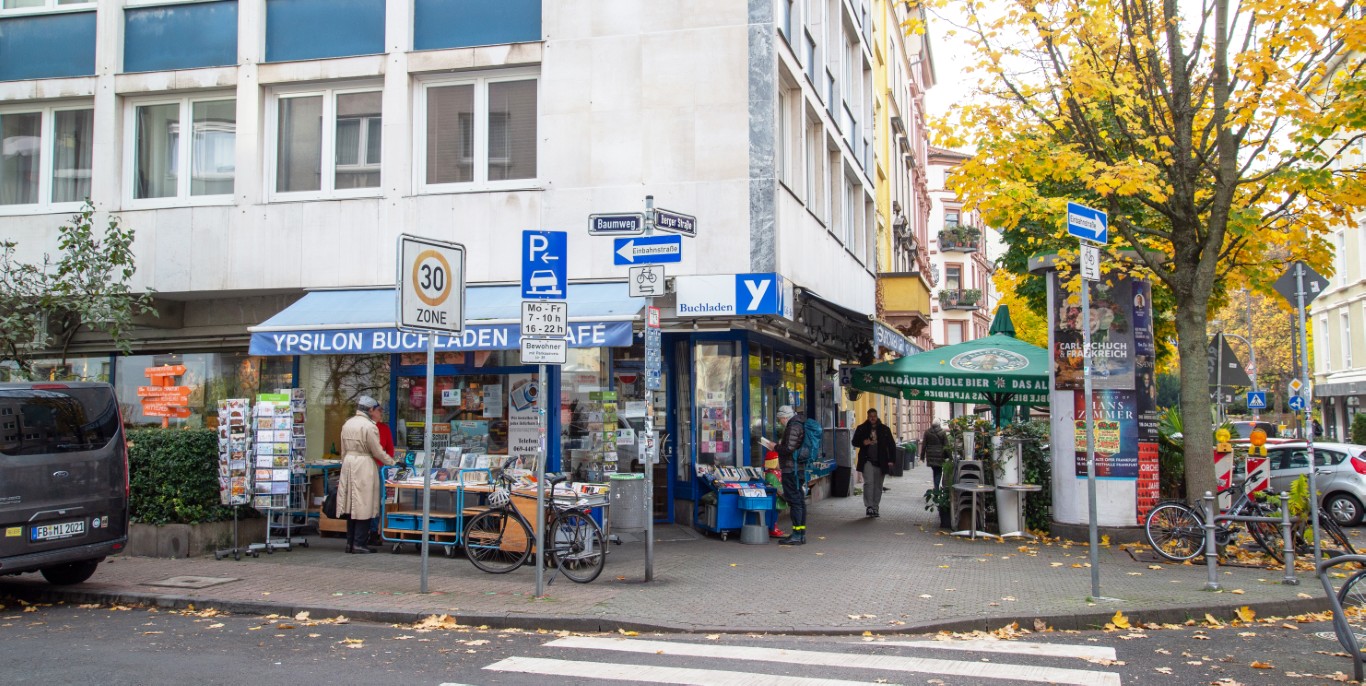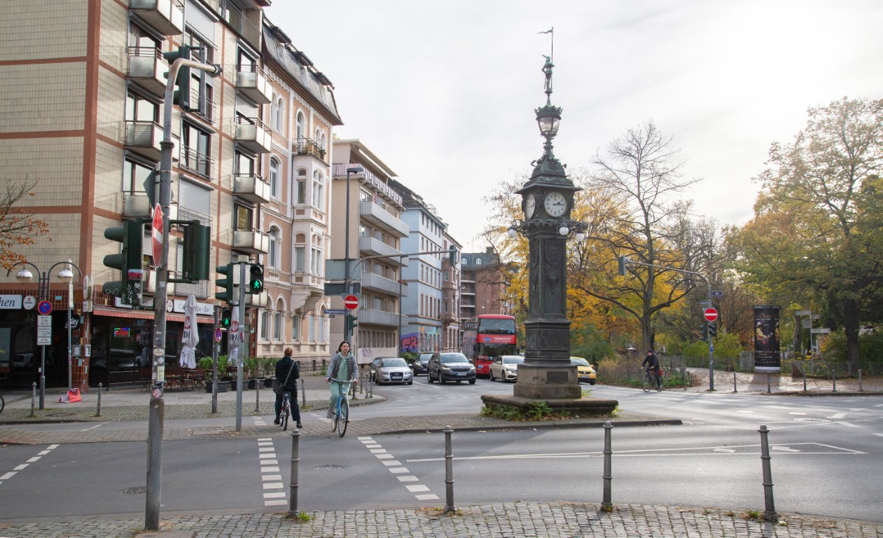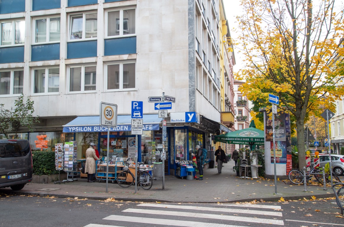 Ffm.-Bornheim: Untere Bergerstraße mit dem Lokal Kupferstecher u. dem Buchladen Ypsilon, Baumweg, Uhrtürmchen u. von Bethmann-Park