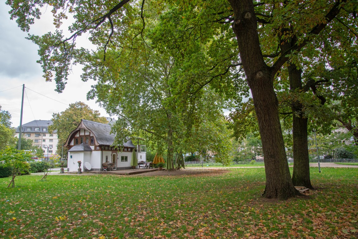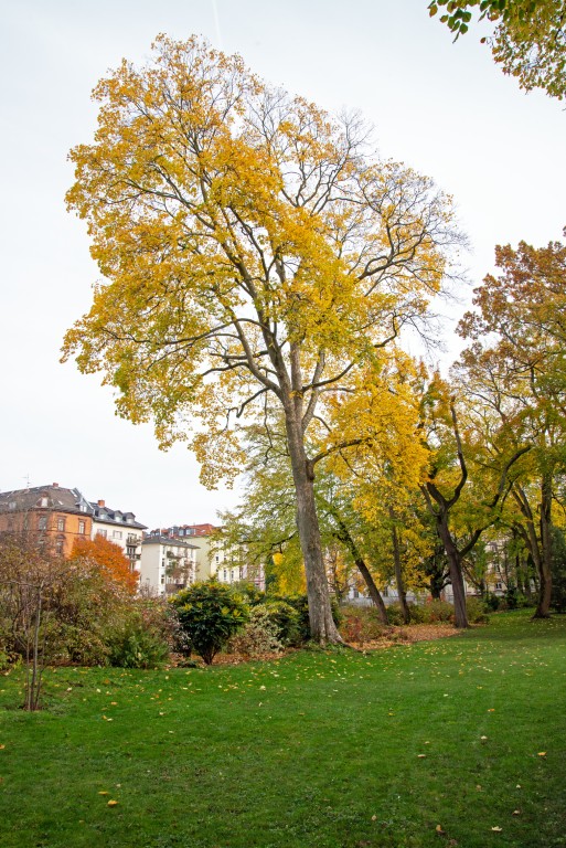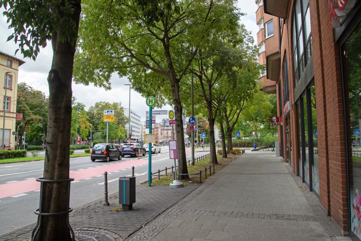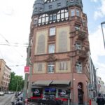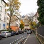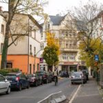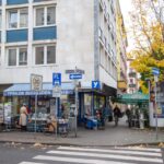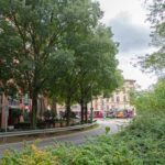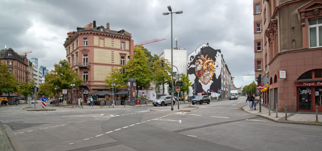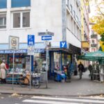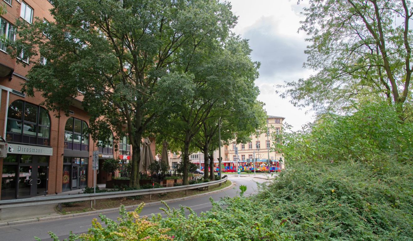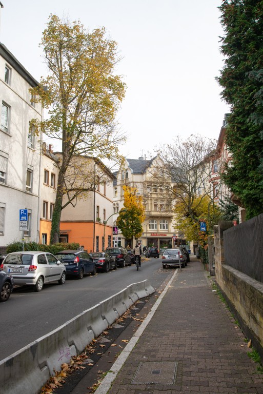Ffm.-Bornheim: Untere Bergerstraße mit dem Lokal Kupferstecher u. dem Buchladen Ypsilon, Baumweg, Uhrtürmchen u. von Bethmann-Park