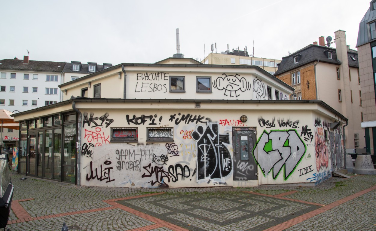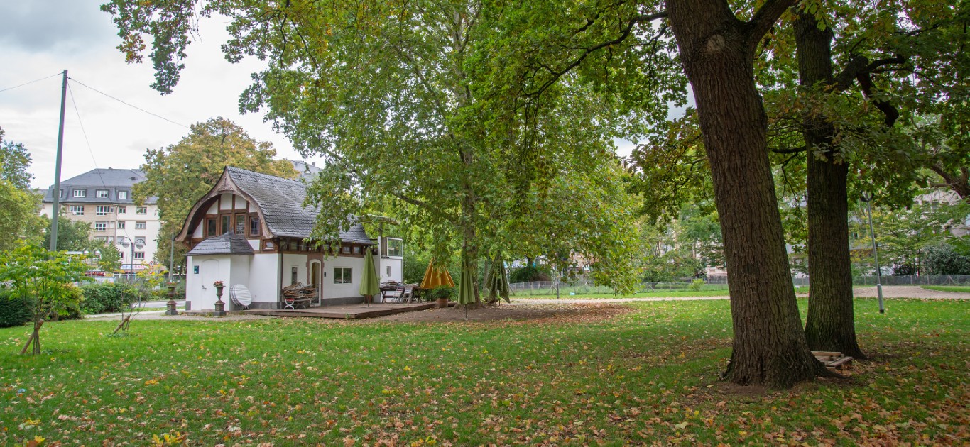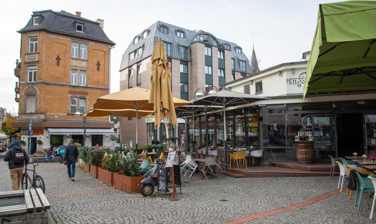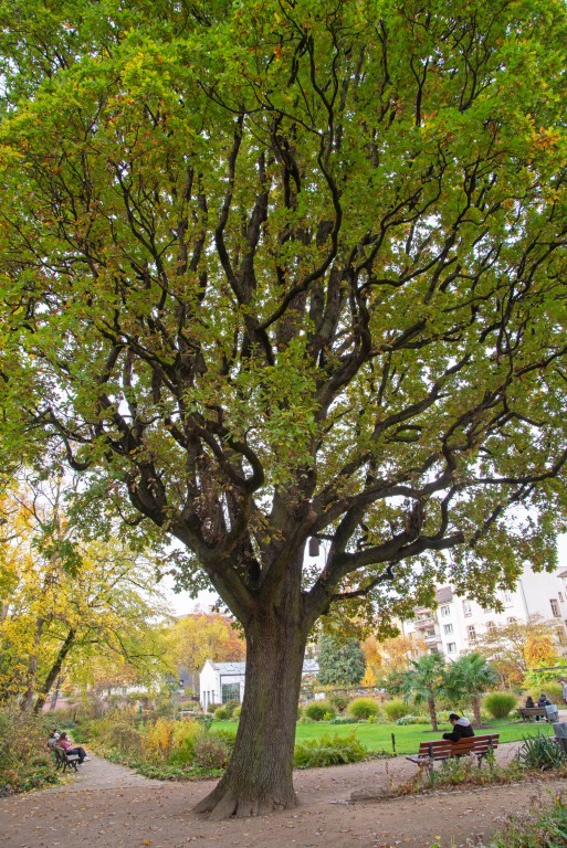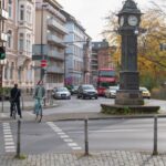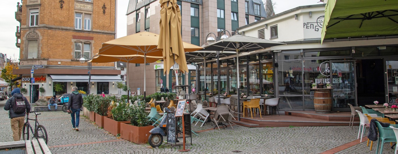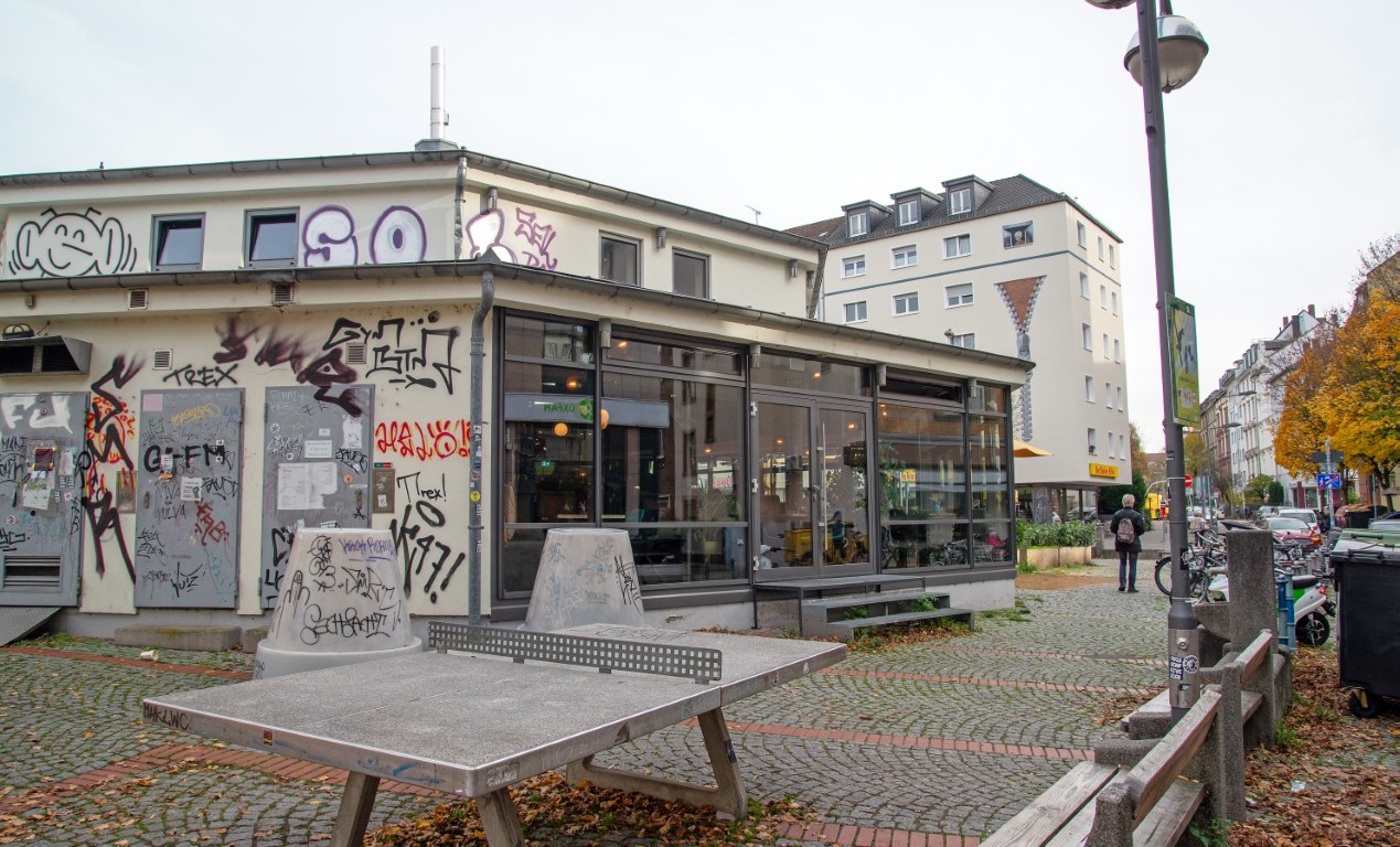 Ffm.-Bornheim: Untere Bergerstraße mit dem Lokal Kupferstecher u. dem Buchladen Ypsilon, Baumweg, Uhrtürmchen u. von Bethmann-Park
