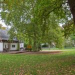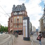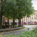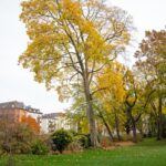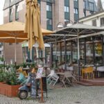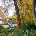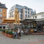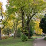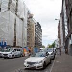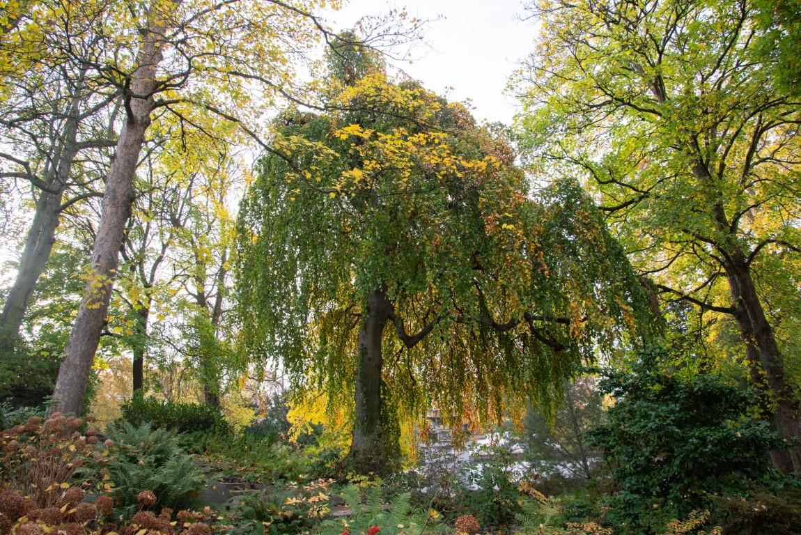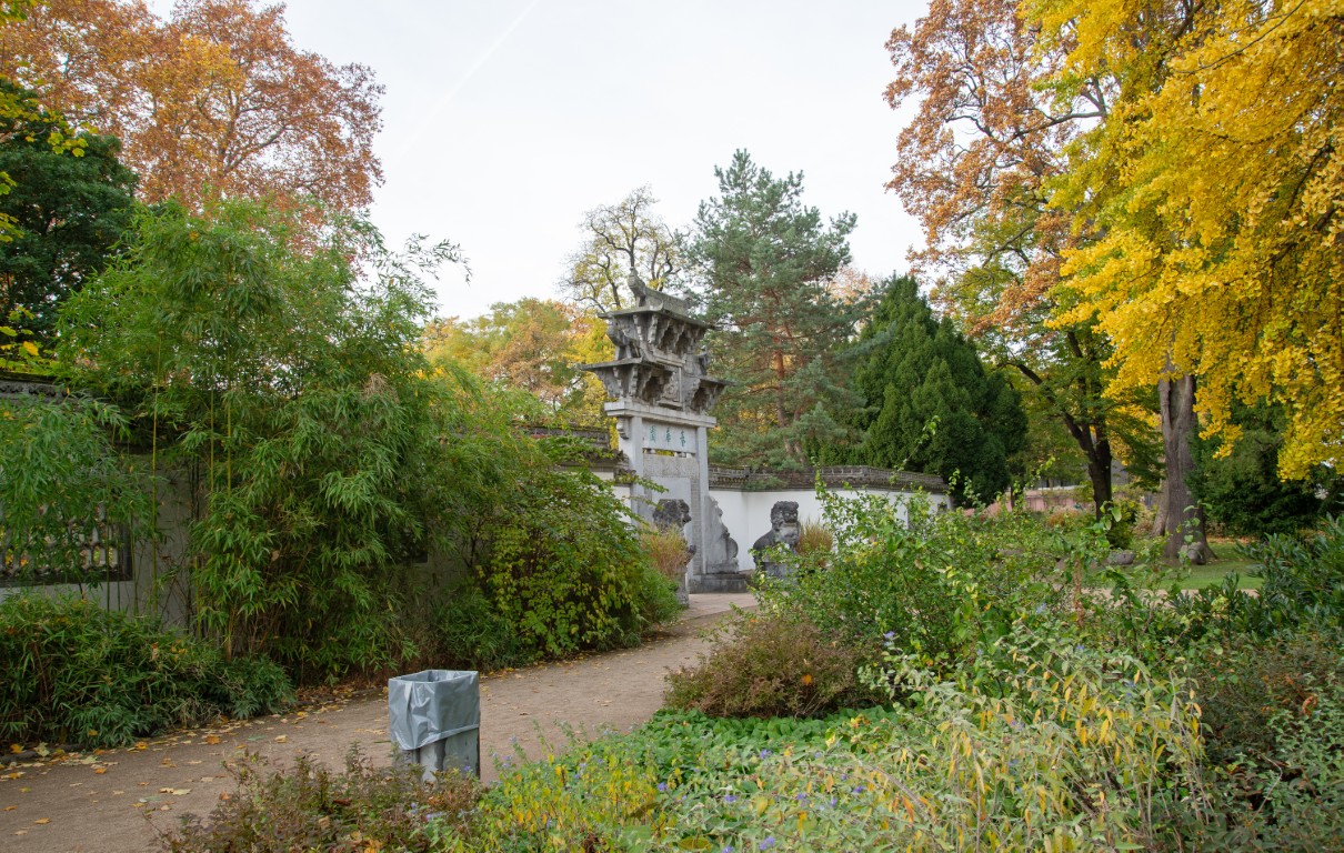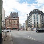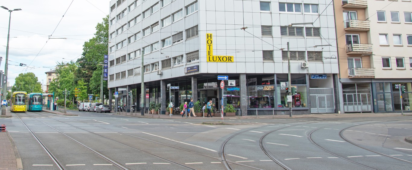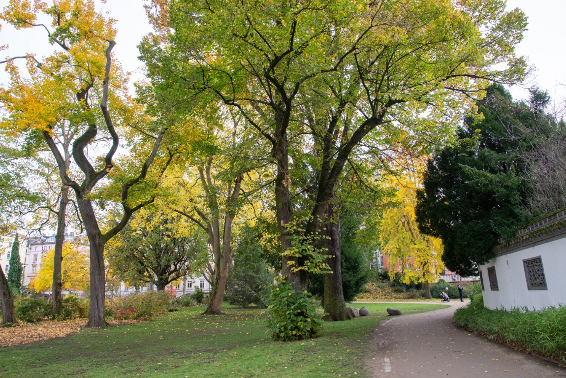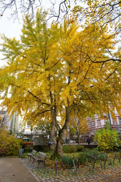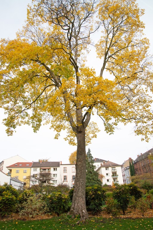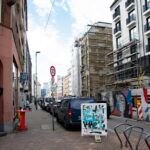 Ffm.-Bornheim: Untere Bergerstraße mit dem Lokal Kupferstecher u. dem Buchladen Ypsilon, Baumweg, Uhrtürmchen u. von Bethmann-Park
